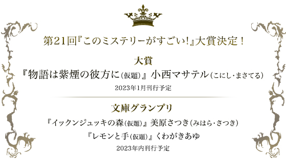 第21回『このミステリーがすごい!』大賞は、447作品の応募があり、1次選考(19作品通過)、2次選考(8作品通過)を経た最終候補の中から、大賞が決定いたしました。賞金は、大賞賞金1,200万円、文庫グランプリ賞金200万円(それぞれ均等に分配)です。(『このミス』大賞事務局)