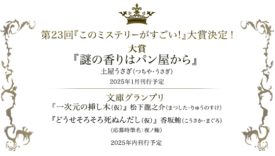 第23回『このミステリーがすごい!』大賞は、403作品の応募があり、1次選考(21作品通過)、2次選考(7作品通過)を経た最終候補の中から、大賞が決定いたしました。賞金は、大賞1,200万円、文庫グランプリ200万円(それぞれ均等に分配)です。(『このミス』大賞事務局)
